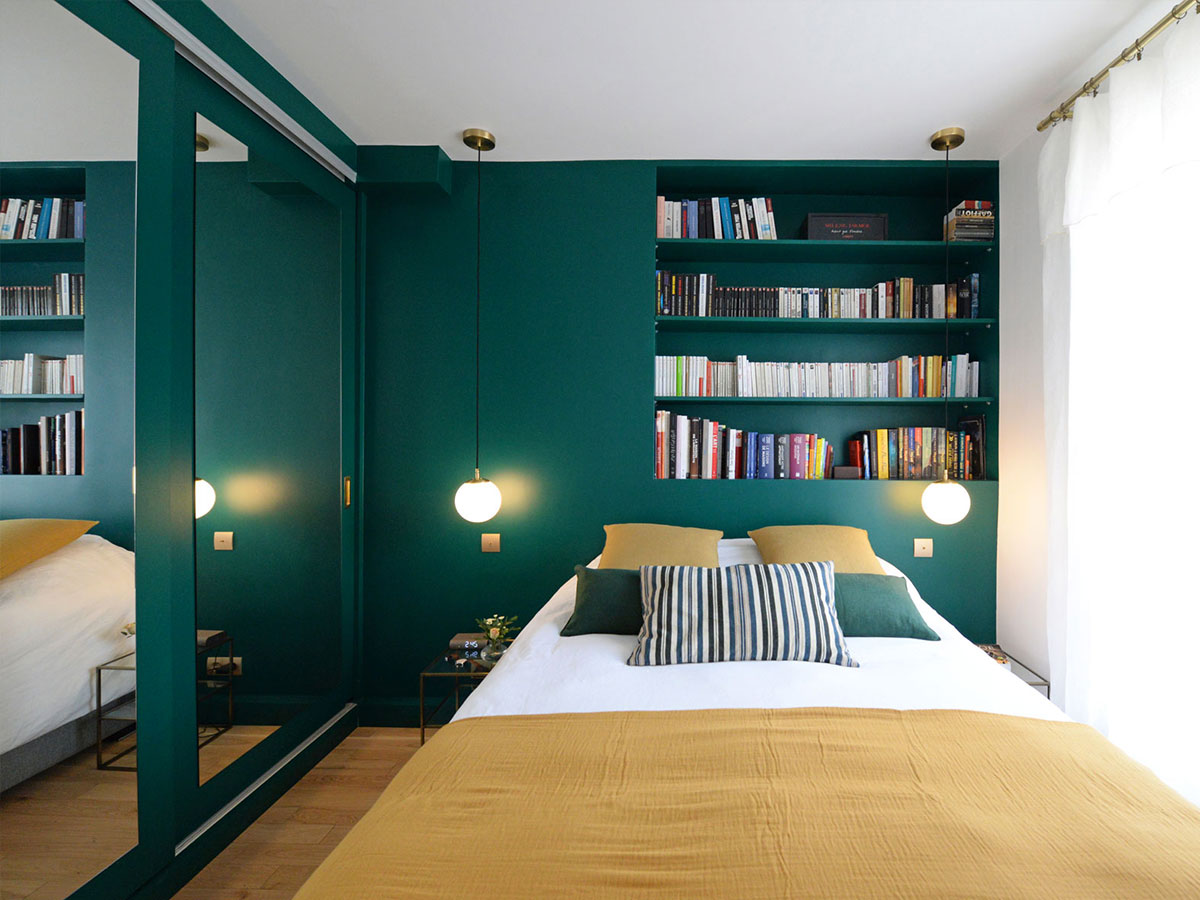 De même, un cadre de lit ou une tête de lit avec rangement permettent d’intégrer aisément un luminaire et les objets du quotidien.