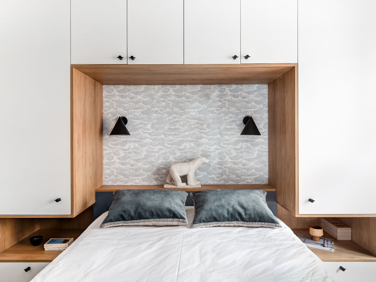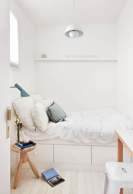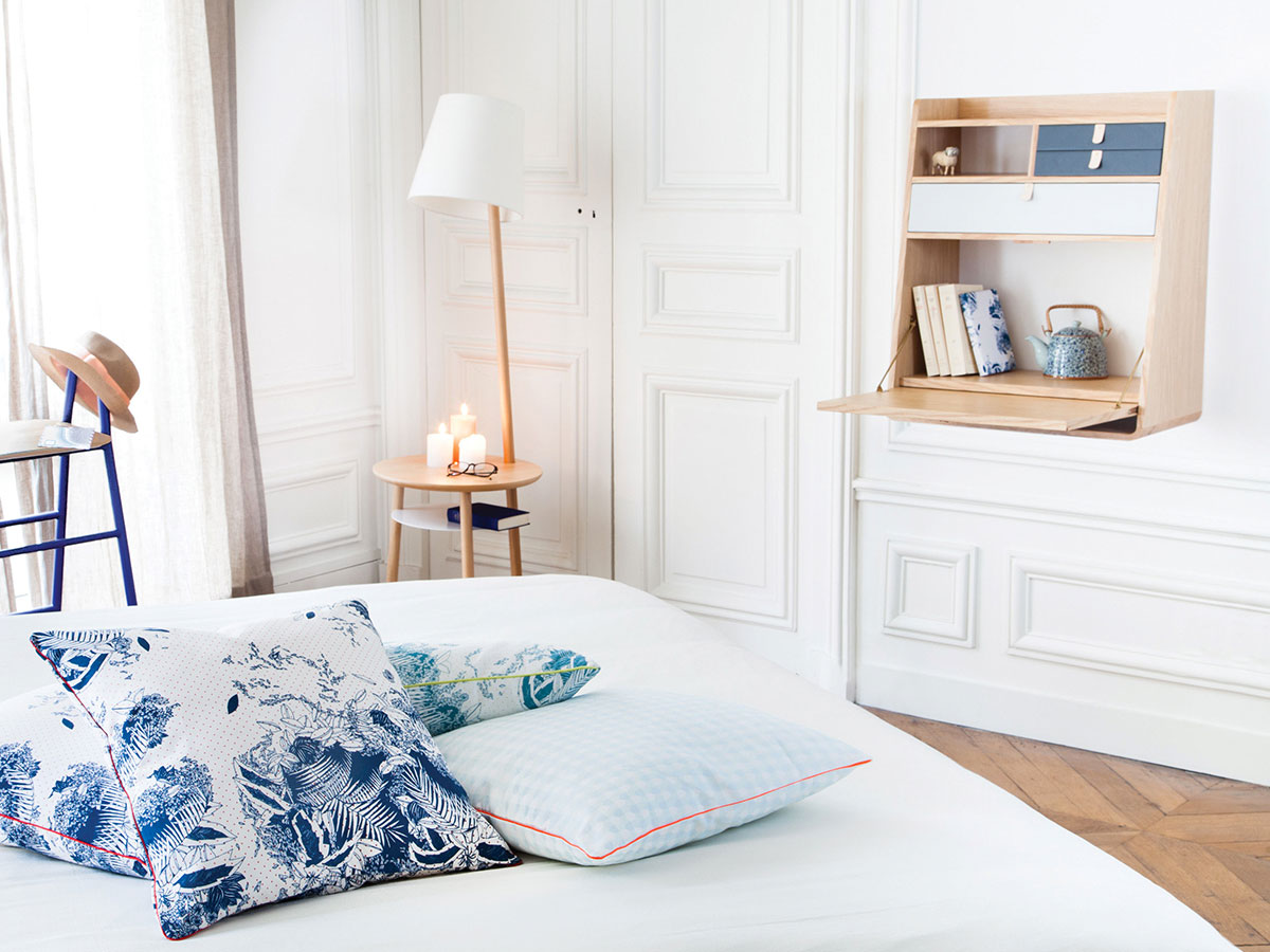 01 | Opter pour des meubles malins : un lit avec des tiroirs ou un cadre de lit avec rangement, un bureau rabattable, des tables de chevet suspendues avec tiroirs.