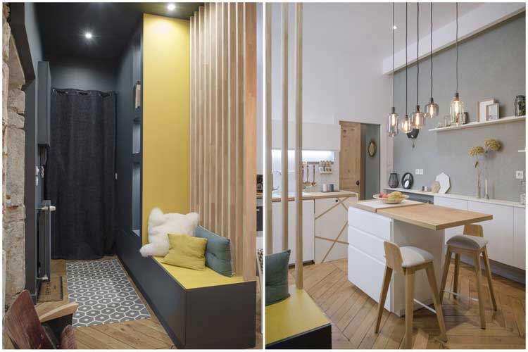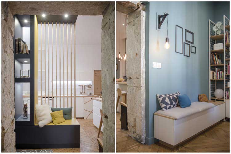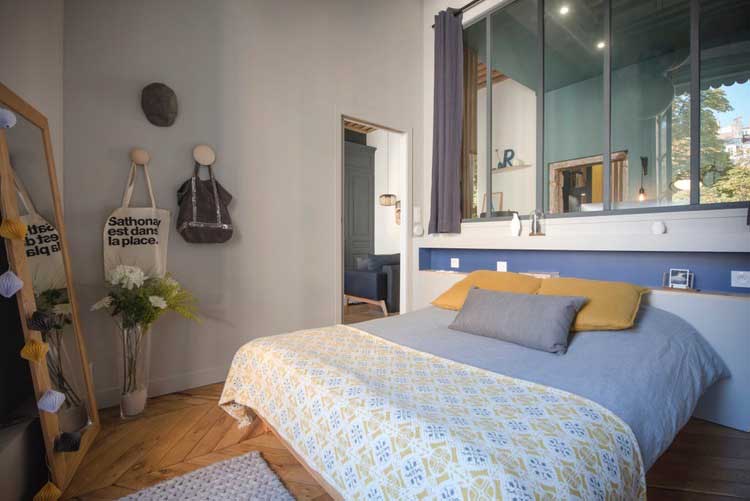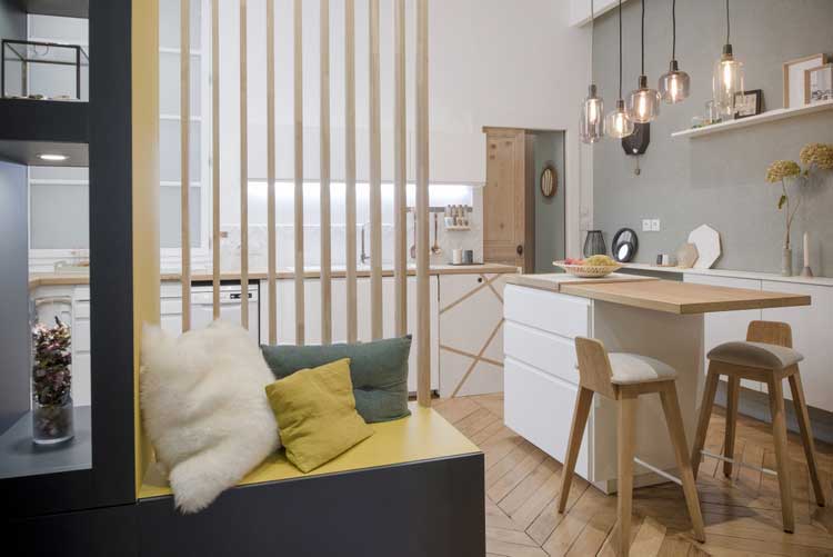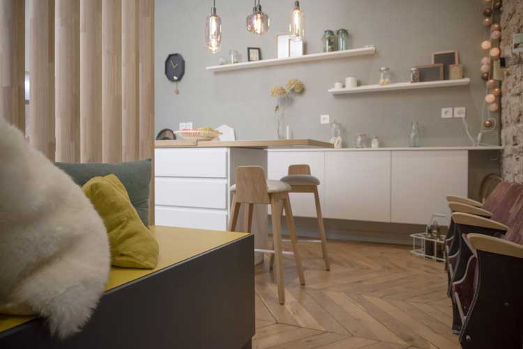 Au final on s’est rendu compte en travaillant pour nous que c’était plus compliqué de faire nos propres choix que de conseiller nos clients. Nous aimons beaucoup de chose, nous sommes toujours à l’affut des dernières tendances et trancher sur certains points n’a pas été chose facile. Nous connaissions nos besoins et il fallait faire rentrer dans 70m² : une chambre, une pièce de vie avec bureau, une grande cuisine et une grande salle de bain. Très peu de contraintes : beaucoup de cloisons et uniquement deux murs porteurs. Un vrai plaisir en tant qu’architecte d’intérieur de pouvoir exploiter l’espace comme bon me semble.