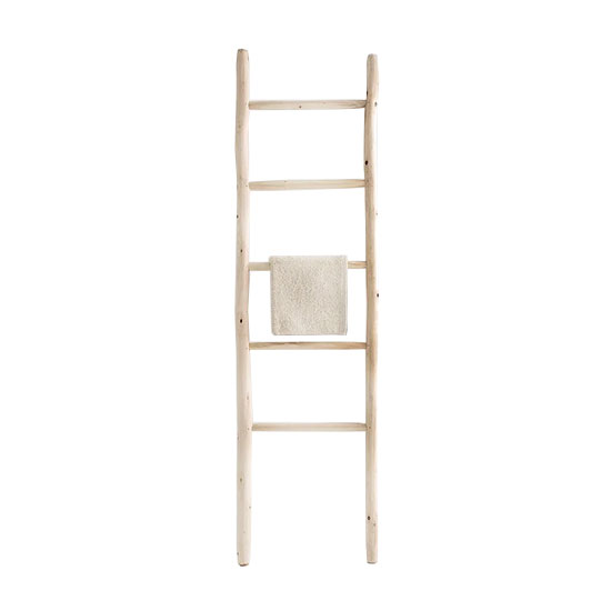 Zen et minimaliste, l’échelle déco est la cerise sur le gâteau en matière d’astuce de rangement de vêtement.
