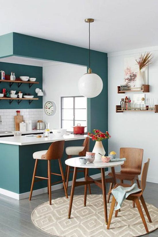 En partant d’un mur bleu canard, différentes associations sont envisageables, comme par exemple associer cette couleur avec du bois de noyer pour un effet rétro.