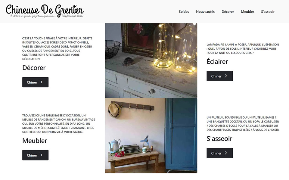 - Vous êtes sensible à l’esprit brocante ? Vous aimez les pièces pleines d’histoire, patinées par le temps mais en très bon état ? Chineuse de Grenier a certainement de quoi vous séduire !
