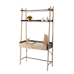 Ce bureau en chêne et métal combine espace de travail et étagères pour décupler votre productivité.