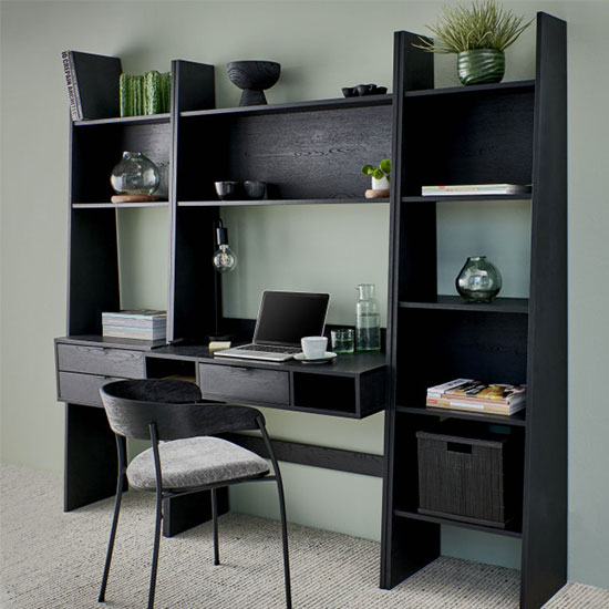 Voici un bureau-étagère entièrement noir au design particulièrement épuré.