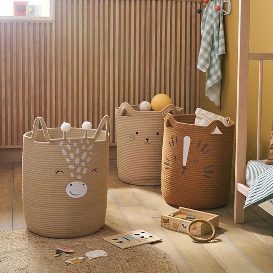 Tapis chambre enfant, objets en rotin, mobiles aériens ou paniers de rangement.