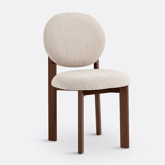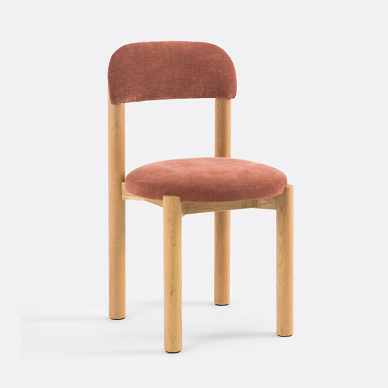 Son dessin repose sur un jeu d’arche subtil : le dossier courbé et les pieds arrière se rejoignent pour former une ligne continue en orme massif. L’assise cintrée, disponible en version rembourrée, apporte un confort essentiel, tandis que le pied avant reprend ce travail sculptural pour créer une harmonie visuelle.