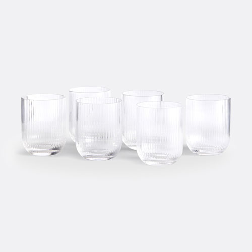 Les couverts sombres se fondent visuellement dans la palette et les verres striés apportent juste ce qu’il faut de lumière.
