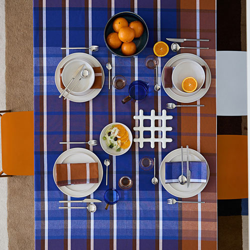 La nappe en coton tissé crée le premier impact visuel avec ses lignes graphiques et ses couleurs profondes.