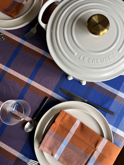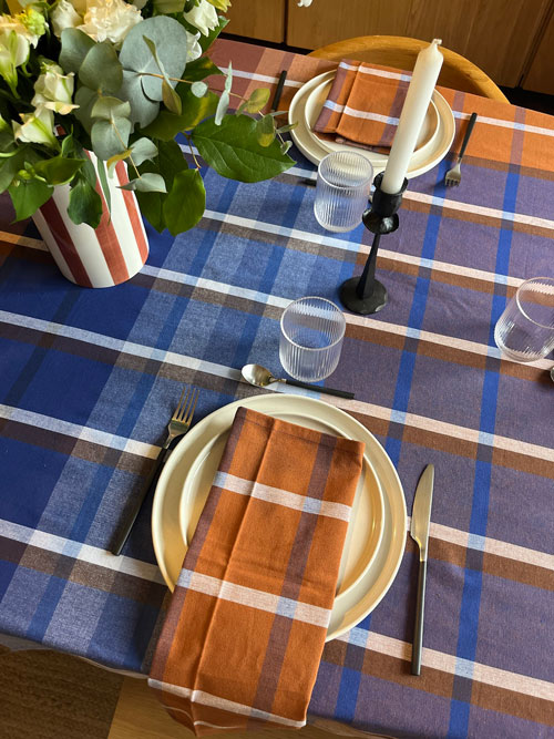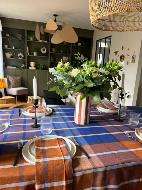 J’aime ensuite jouer sur les contrastes : une nappe aux couleurs fortes apporte du caractère, tandis qu’une vaisselle en grès clair garde l’ensemble équilibré.