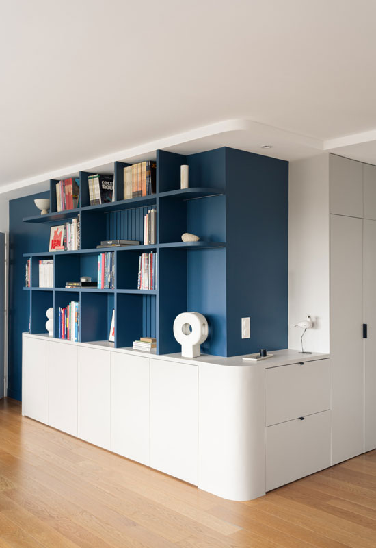 Les murs de la bibliothèque permettent de structurer la pièce tout en évitant un encombrement visuel – Anne Chemineau