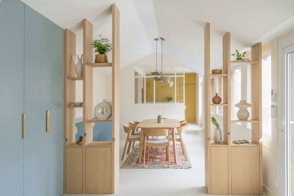 Des étagères ouvertes font office de séparation tout en permettant d’exposer de beaux objets déco – Adeline Pithois Guillou