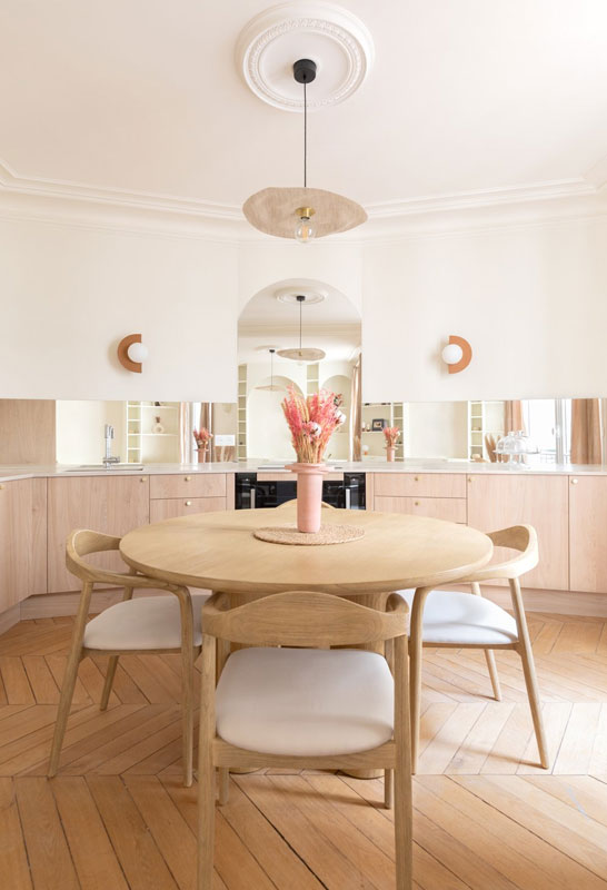 Une table en chêne massif, des chaises en bois clair ou un parquet en chêne huilé apporteront une touche intemporelle.