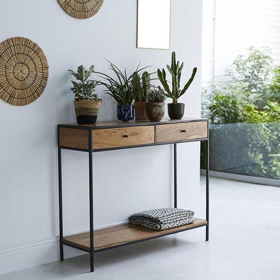 Le bel aspect veiné du bois d’acacia et sa teinte chaude font de cette console un meuble sobre, mais chaleureux.
