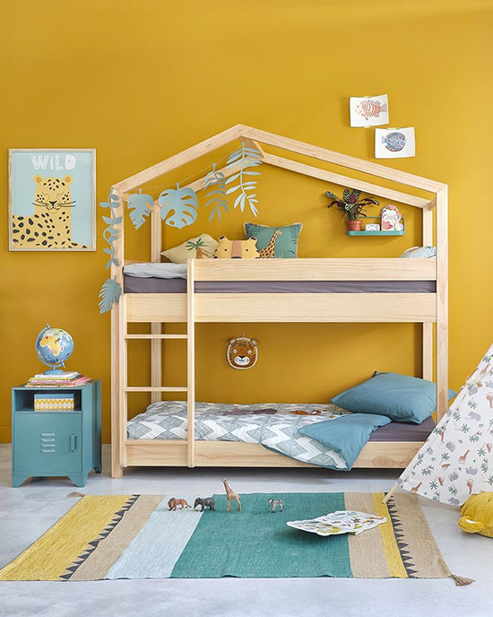 Plus doux et chaleureux, le jaune curry sera parfait pour mettre en valeur un lit mezzanine enfant en bois ou pour délimiter un coin bureau.