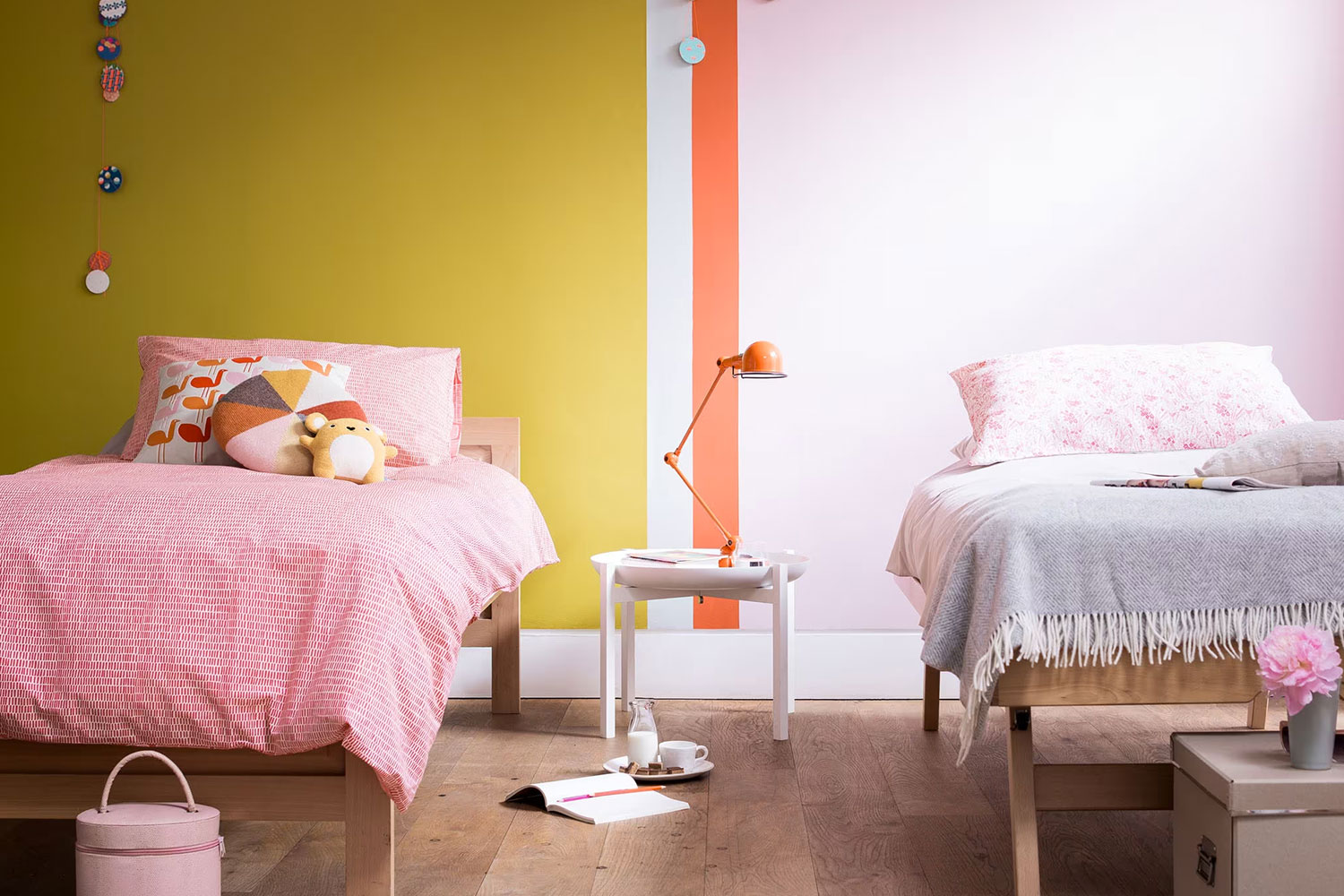 Pour une chambre vitaminée, associez des couleurs tendance telles que le rose pastel, le jaune moutarde et l’orange vif.