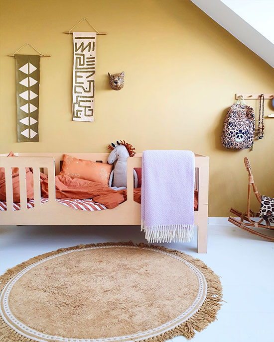 Et si vous préférez conserver des tons neutres sur les murs, osez la couleur sur un tapis chambre d’enfant ou sur du linge de lit imprimé !
