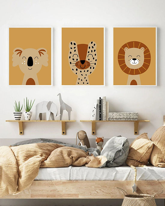 Les petits aventuriers adoreront l’esprit jungle d’un mur couleur vert kaki, associé à un lit cabane et à des affiches à l’imprimé animalier.