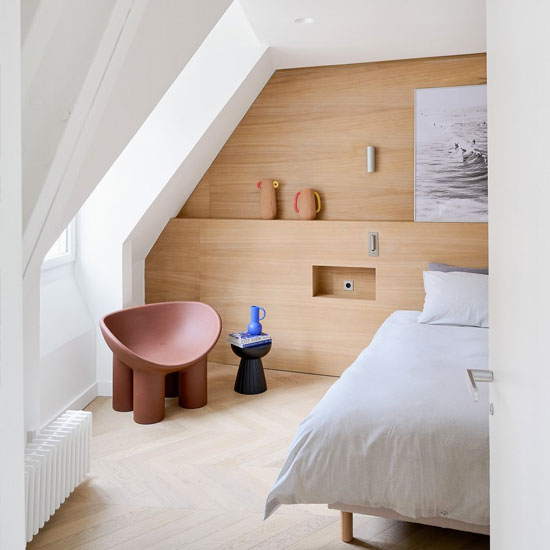 Nous aimons les couleurs froides et apaisantes pour une chambre principale, par exemple des bleus pâles associés au bois et au lin. Par ailleurs, des couleurs profondes peuvent créer une sensation enveloppante pour apporter une ambiance relaxante. Cet espace doit favoriser le sommeil, le calme et la détente.