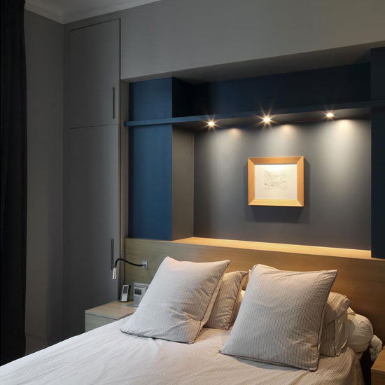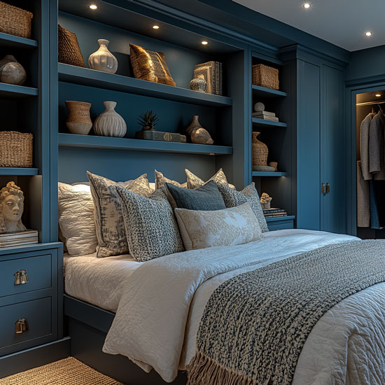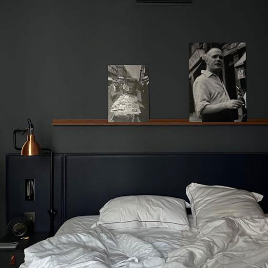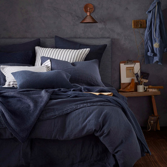 Le bleu marine, le gris anthracite et l’aubergine apportent profondeur et caractère à votre chambre, la transformant en un espace élégant.