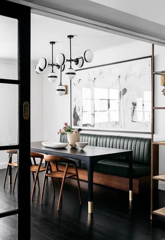 La tendance des meubles clairs, du blanc et du bois blond va parfaitement avec le noir et avec une pièce telle que la salle à manger.