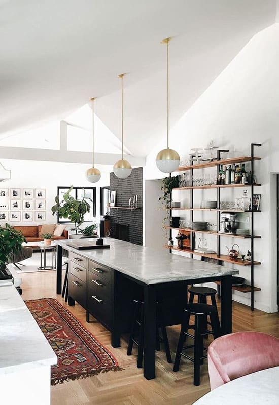 Que vous utilisiez un de ces matériaux sur le plan de travail et/ou en crédence, il cassera l’effet trop noir et donnera un contraste intéressant.