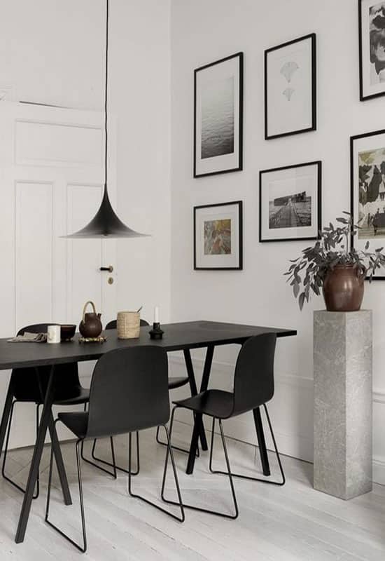 A l’inverse et afin de créer une autre dimension à la pièce, optez pour une table et des chaises noires devant un mur blanc.