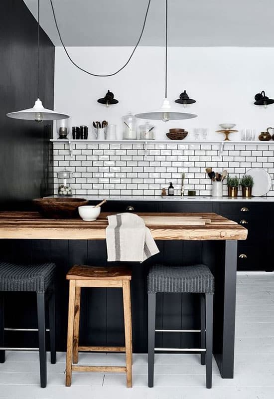Facile d’imaginer une cuisine noire rehaussée par un plan de travail en bois ou en marbre blanc, chaque élément ressortira alors et créera un très beau résultat.
