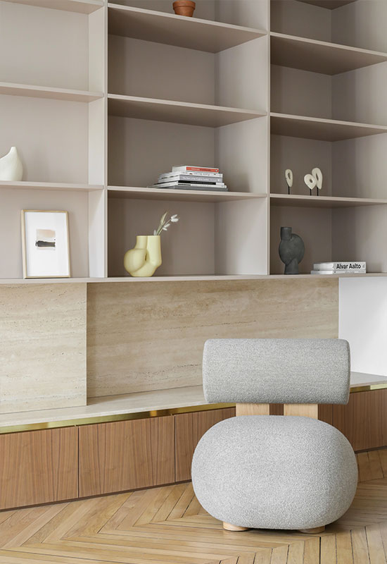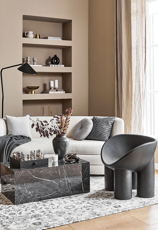 Pour apporter du relief à la pièce, l’idée est de faire contraster cette couleur neutre avec des teintes plus claires ou plus foncées.