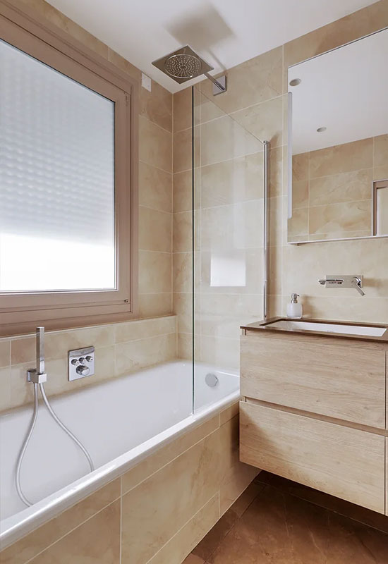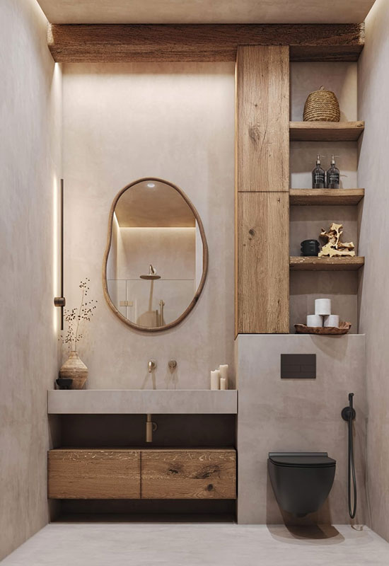 En association avec une teinte taupe tirant vers le brun-rosé aux murs et un sol en béton ciré, ces derniers viendront créer une atmosphère “spa” irrésistible !