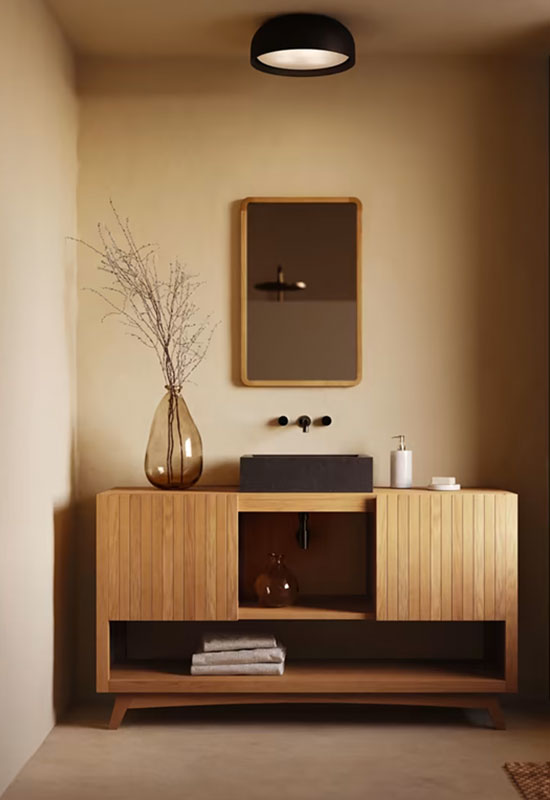 Associer la peinture murale taupe à un meuble de salle de bain en bois massif surmonté d’une vasque en pierre est une combinaison gagnante.