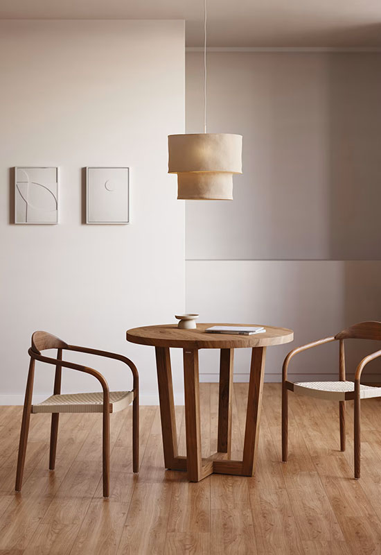 On peut par exemple imaginer des murs taupe contrastés par un plafond blanc, encadrant une table à manger en bois blond entourée de chaises de couleur noire.
