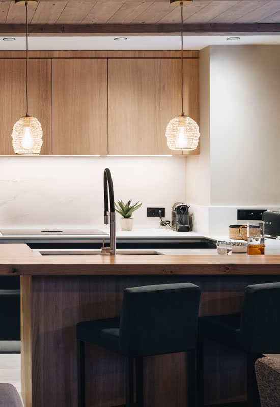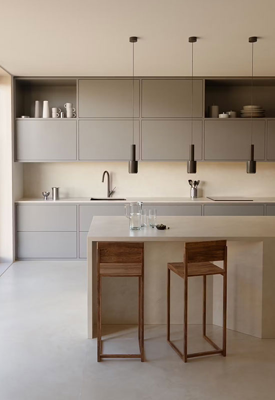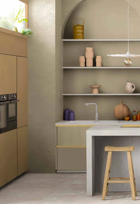 S’il investit les murs, le ton mat de la teinte taupe sera sublimé par les contrastes de teintes plus clairs sur les différents éléments de la cuisine.