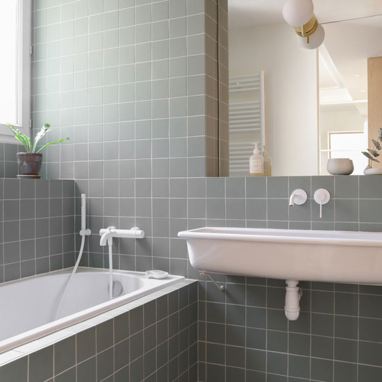 Dans une salle de bains, du gris perle sur un carrelage ou un mur créera une ambiance douce et reposante.