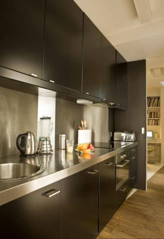 Côté couleur, le noir complète bien le métal, gardez-le pour les placards et décorations, puisque toutes vos surfaces utiles et électroménager seront en inox !