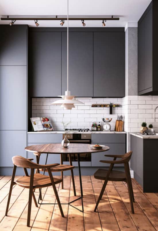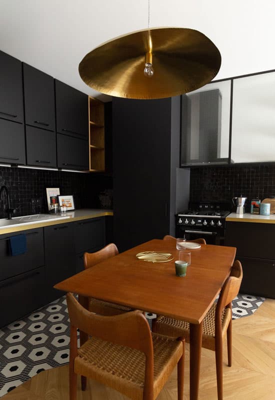 Avec une cuisine couleur charbon, préférez un sol qui tranche pour ne pas donner une impression d’enfermement.