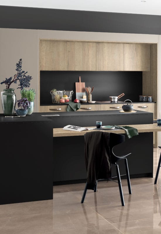 Pour une cuisine noire et bois, dosez minutieusement les éléments naturels avec les matières et formes contemporaines.