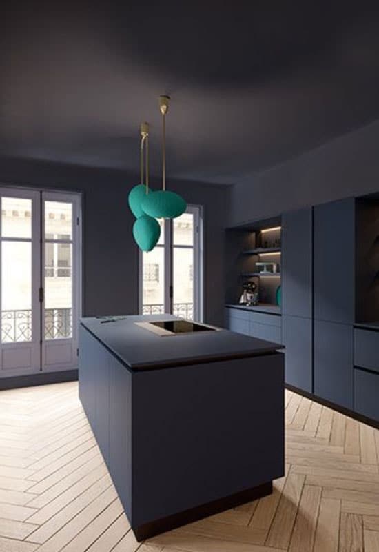 Moins courant dans la cuisine, le bleu offre pourtant un bel ensemble avec une cuisine noire.