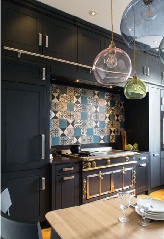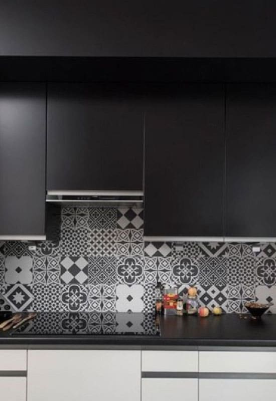Lorsque le noir domine dans la cuisine, la crédence peut amener de la couleur, un contraste, une nuance ou de l’originalité avec un joli motif.