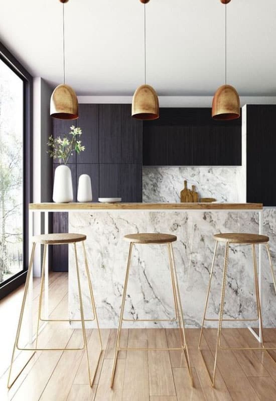 Une suspension en laiton est incontournable, vous pouvez aussi songer à des poignées de porte ou encore une crédence dorée.