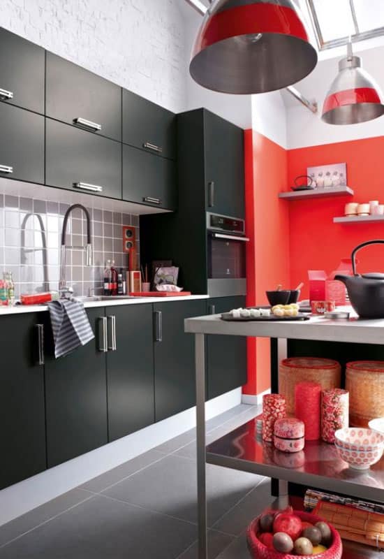 Pour un coup de pep’s, optez pour une couleur vive sur un des murs, votre cuisine noire ressortira d’autant plus !