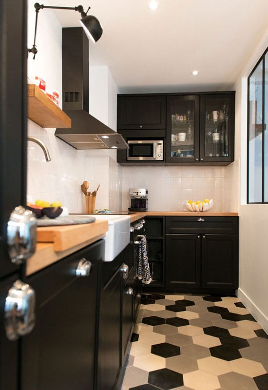 La petite cuisine noire se veut discrète, jouez de détails et de textures pour lui apporter du cachet.