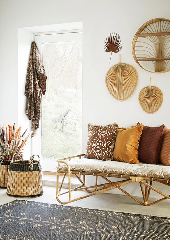 Tapis berbère, panier en rotin, meuble en cannage, tissage mural en macramé, suspension en bambou…