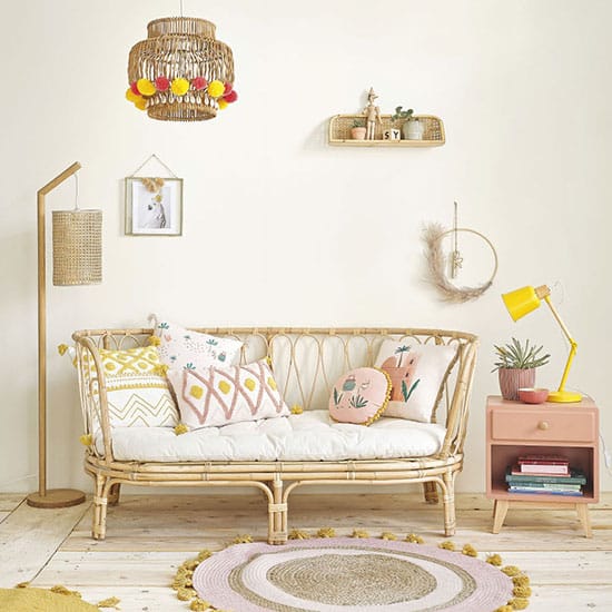 Dans un coin de la pièce, installez une banquette ou un fauteuil en rotin pour un coin lecture douillet et exotique.