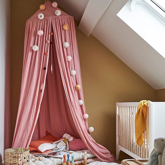 Tombant du plafond pour envelopper le coin dodo, il crée un espace cocooning aux airs de conte de fées.