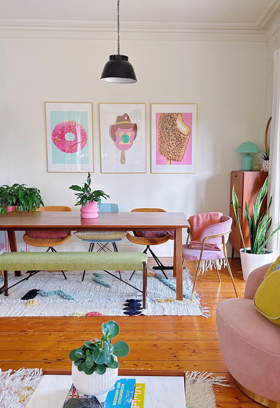 Déco de salle à manger atypique et colorée en vert et rose