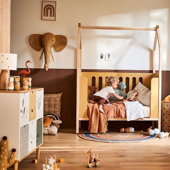 Chambre enfant chaleureuse et ludique en coloris bruns et notes plus vives