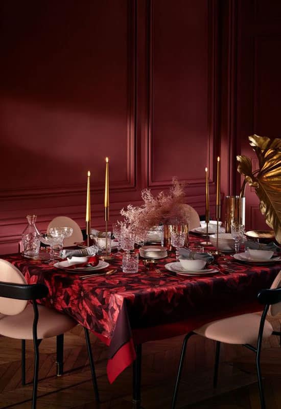 Ou alors mur et plateau de table bordeaux/chaises design. Voire un total look des plus cosy avec nappe, bougeoirs et fioritures.