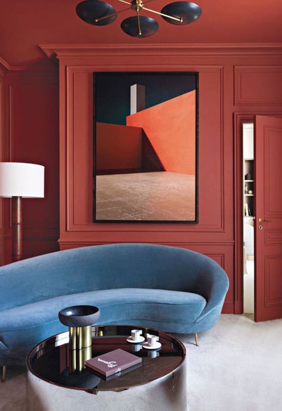 Bordeaux et velours vont de pair pour un rendu feutré dans un séjour, à l’image de ce canapé associé à un mur bordeaux à moulures.