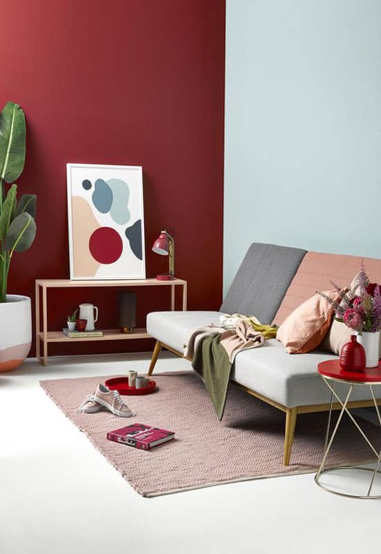La couleur bordeaux est idéale pour le salon, pièce à vivre sollicitée au quotidien, rimant avec confort et convivialité.