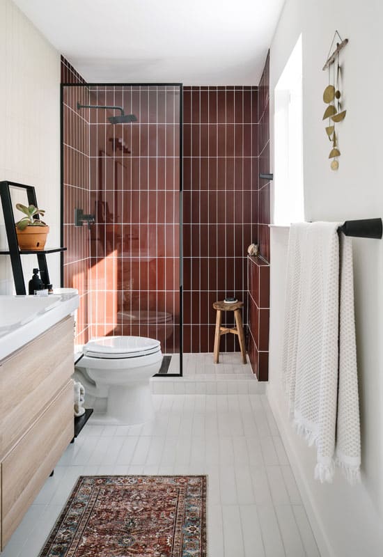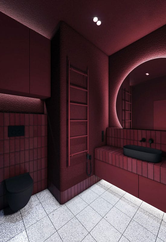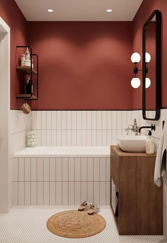 - Mur peint en bordeaux/carrelage blanc/détails noir